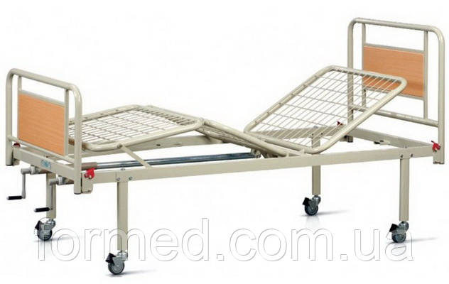 Функціональне медичне ліжко, оснащене двома ручками-важелями для можливості регулювання підйому і опускання секцій для ніг і для голови. Комфортне ложе для хворого металеве, спинки з дерев'яними панелями, без гострих кутів.